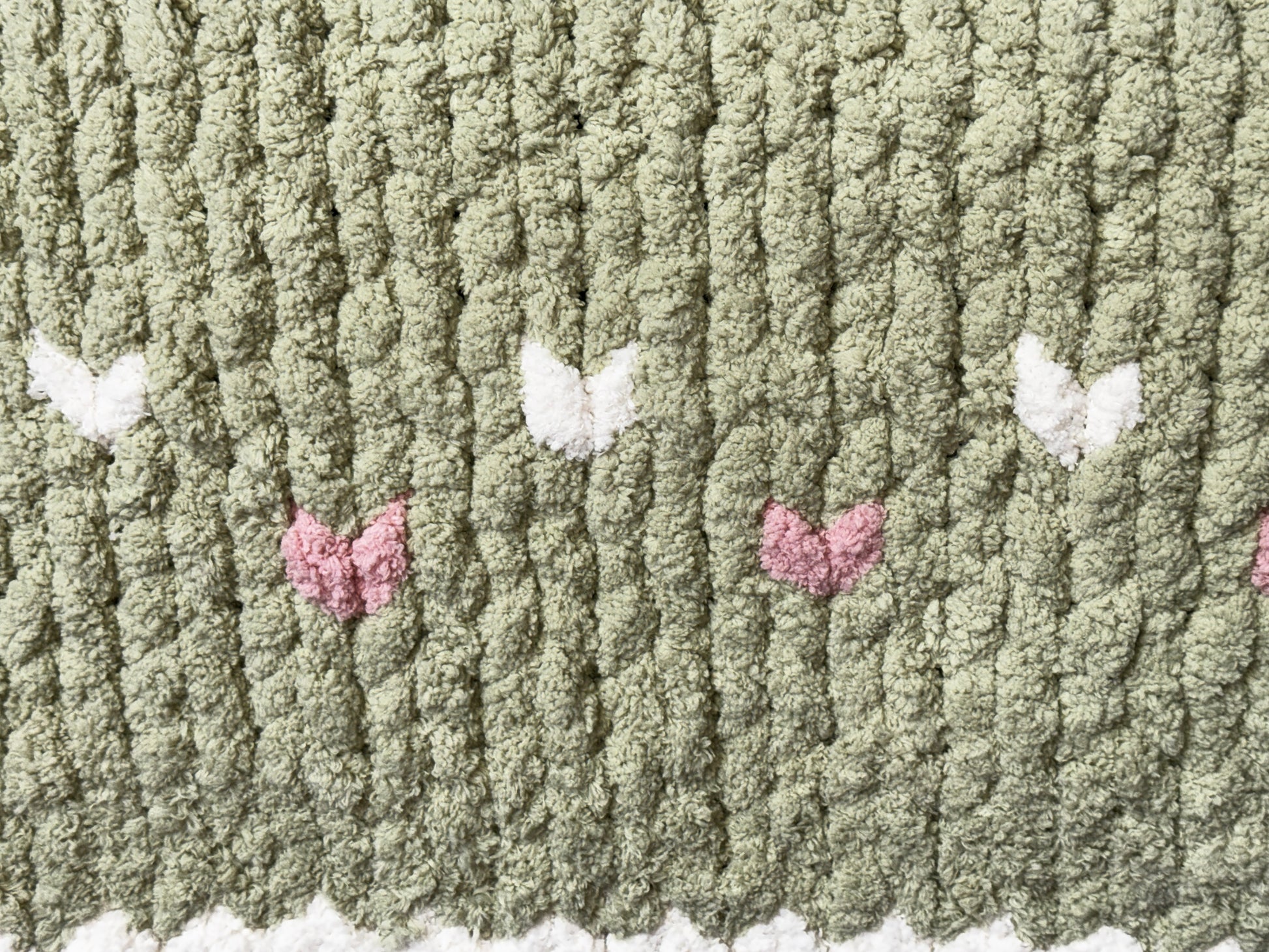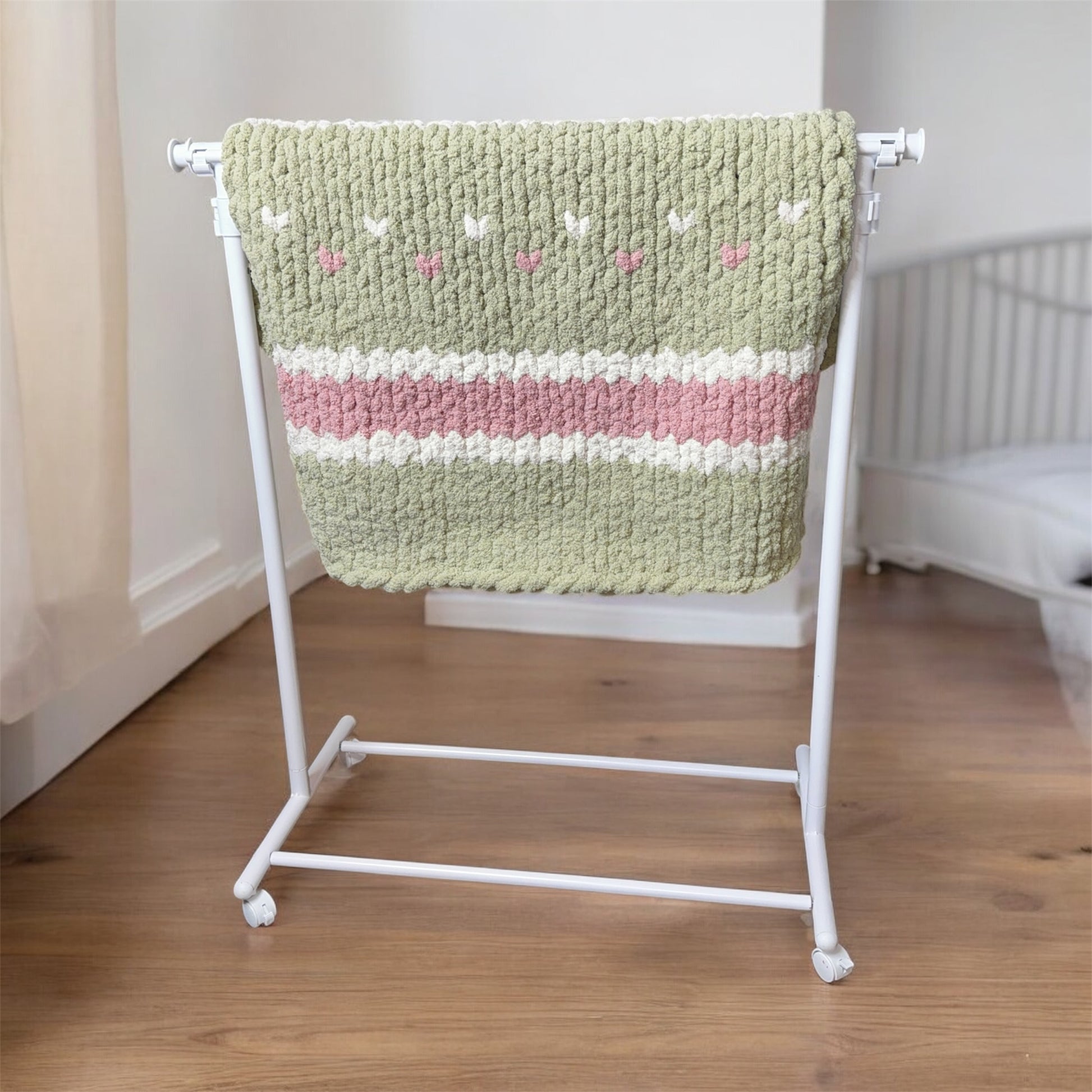 This blanket is a Custom Handmade Maine Spruce Heart ~33" x 40" Tight-Knit Chunky Baby Blanket in sage, ivory and bridesmaid. This blanket comes with hearts added in as I am knitting.
